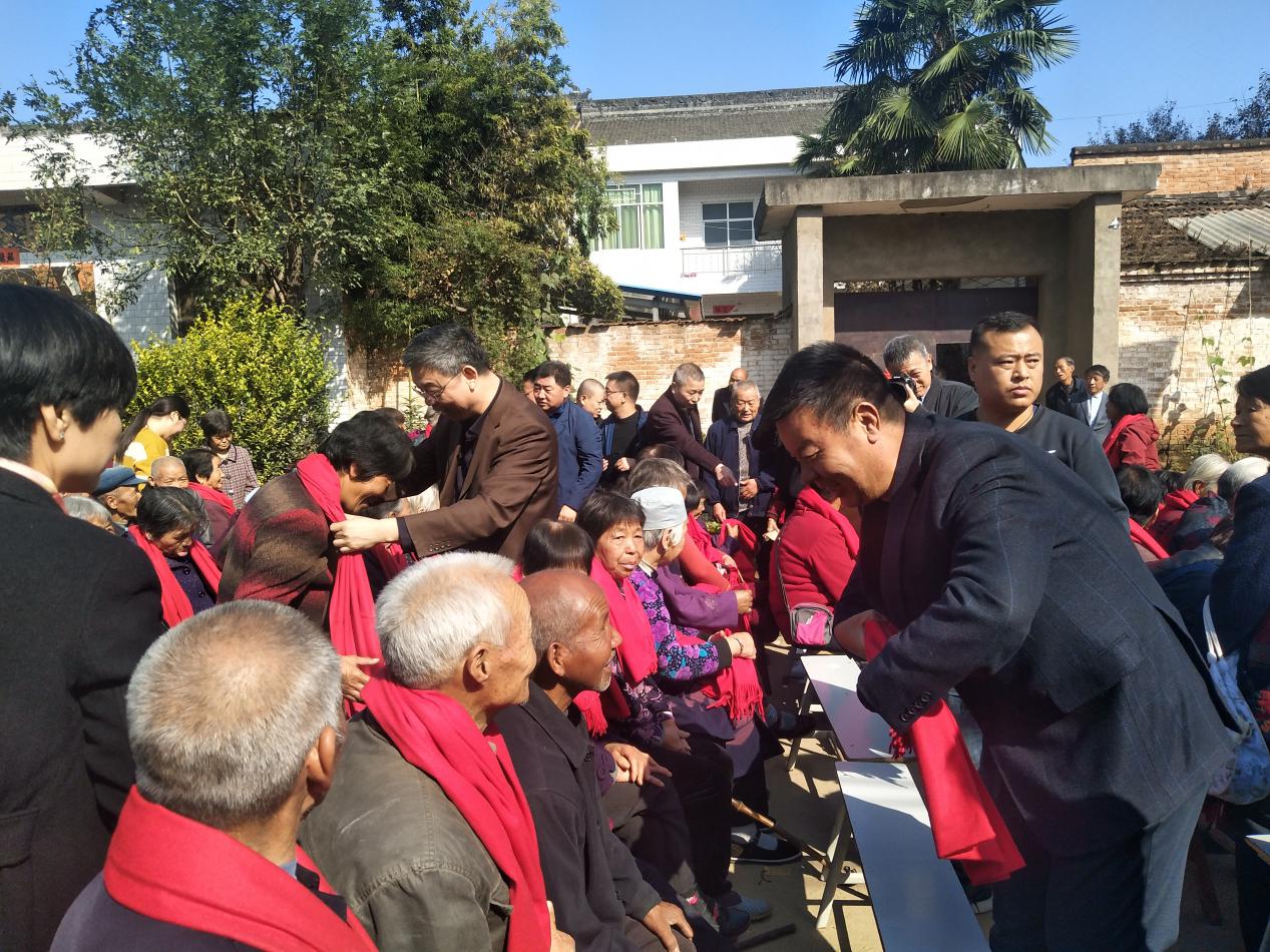 接下來,市水務局副局長劉博和公司董事長王長隨為村里的老人們佩戴紅圍巾。暖暖的紅圍巾,滿滿的民生情。戴著滿載孝意的紅圍巾,老人們臉上洋溢著笑容,倍感溫馨。